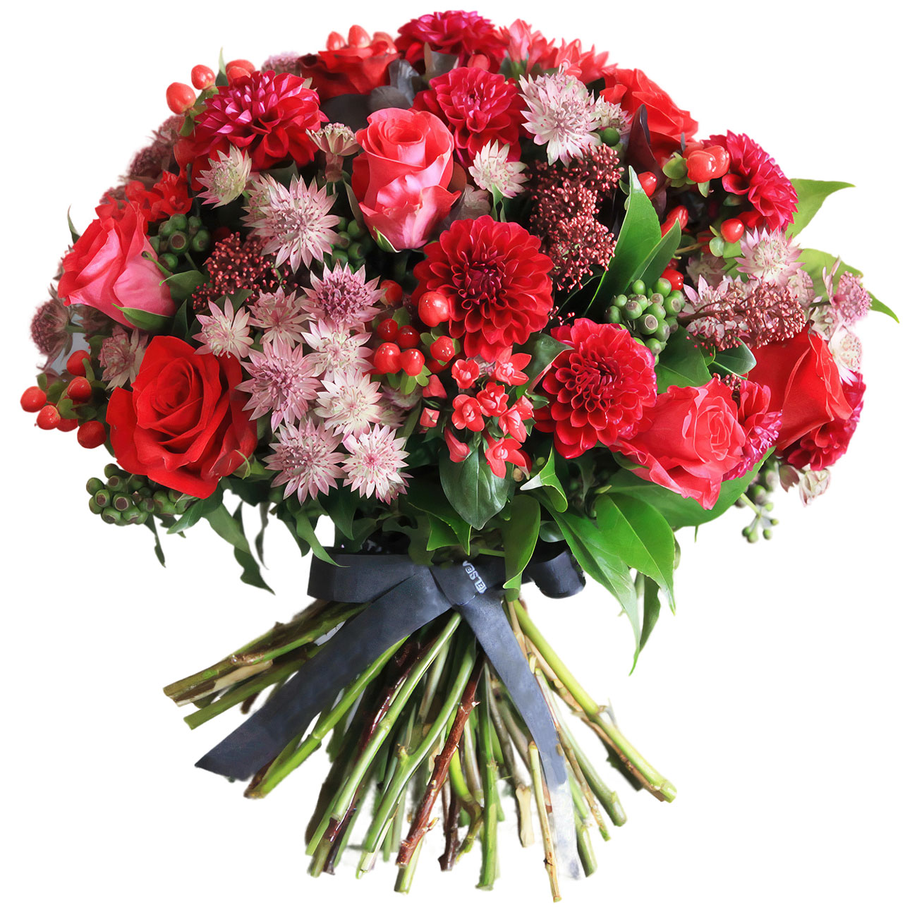 Георгина красная, роза одноголовая красная и розовая, астранция, гиперикум, салал. Упаковка (лента, пленка, крафт, сетка, пленка матовая)