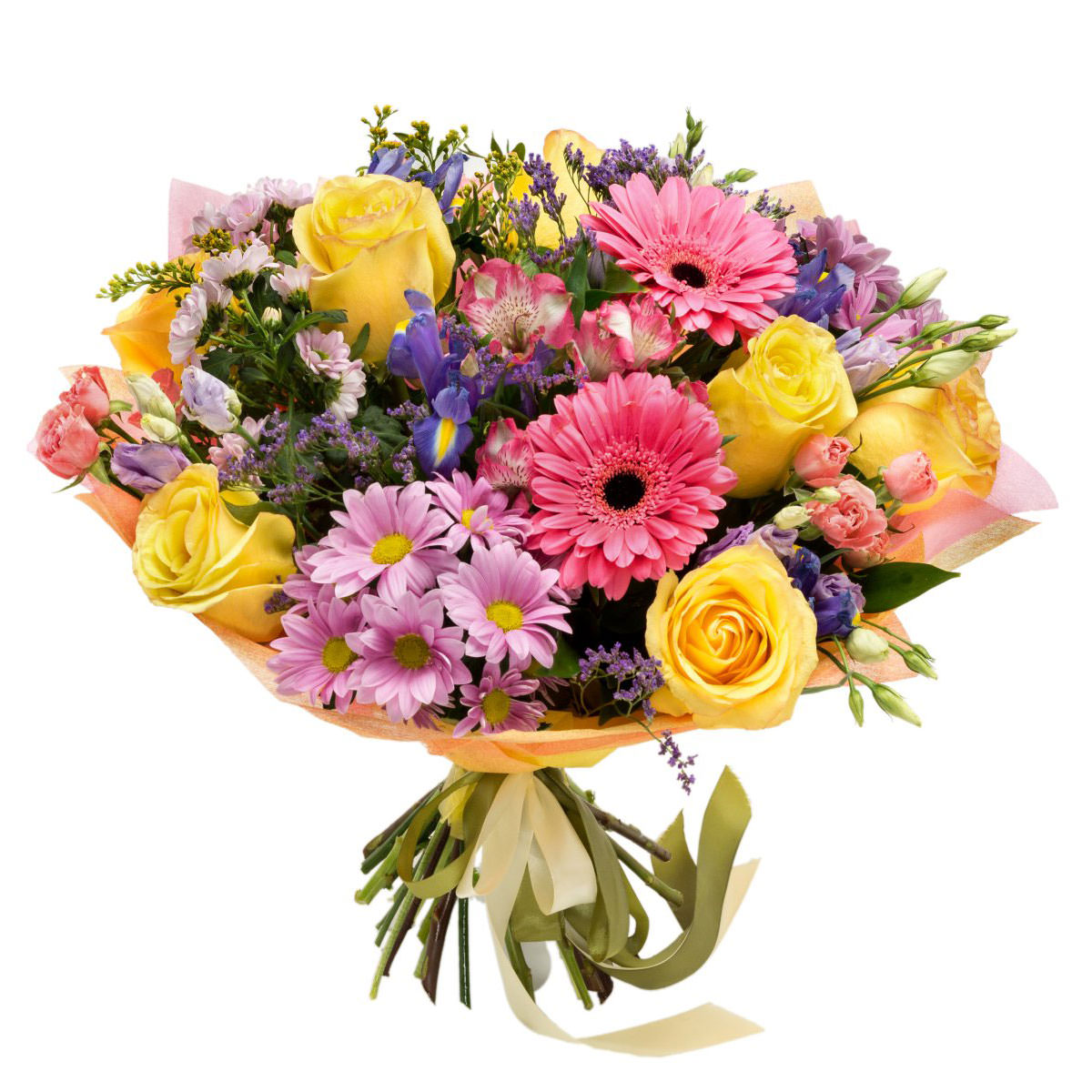Хризантема кустовая сиреневая, гербера розовая, роза одноголовая желтая, ирисы, статица, альстромерия розовая, роза кустовая розовая, эустома фиолетовая, зелень. Упаковка (лента, пленка, крафт, сетка, пленка матовая)