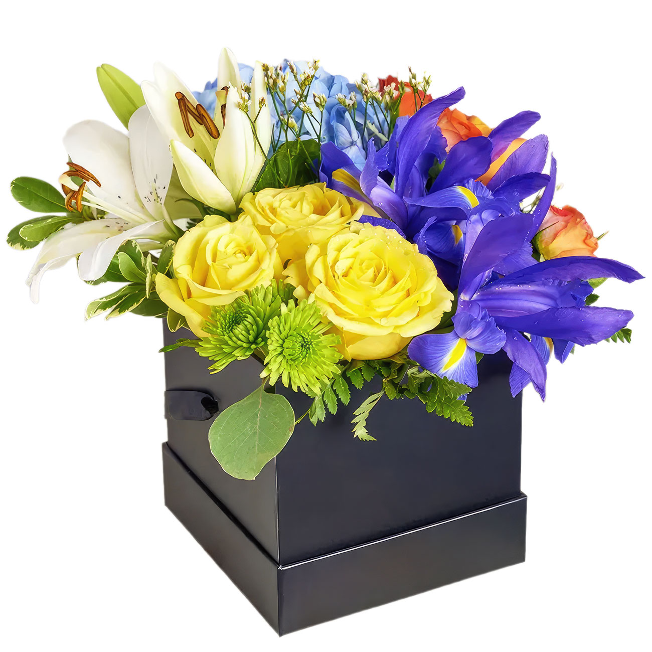 Роза одноголовая желтая, ирис, лилия, хризантема кустовая зеленая, роза кустовая, гортензия, папоротник. Упаковка (шляпная коробка, квадратный бокс, коробка сердце, оазис)