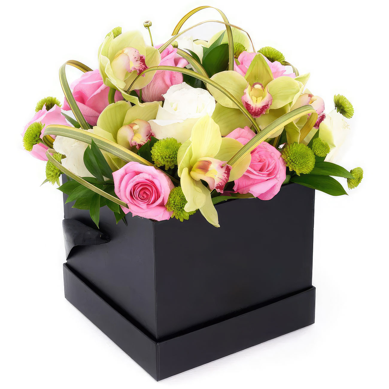 Орхидея желтая, роза одноголовая розовая, белая, хризантема кустовая зеленая, зелень. Упаковка (шляпная коробка, квадратный бокс, коробка сердце, оазис)